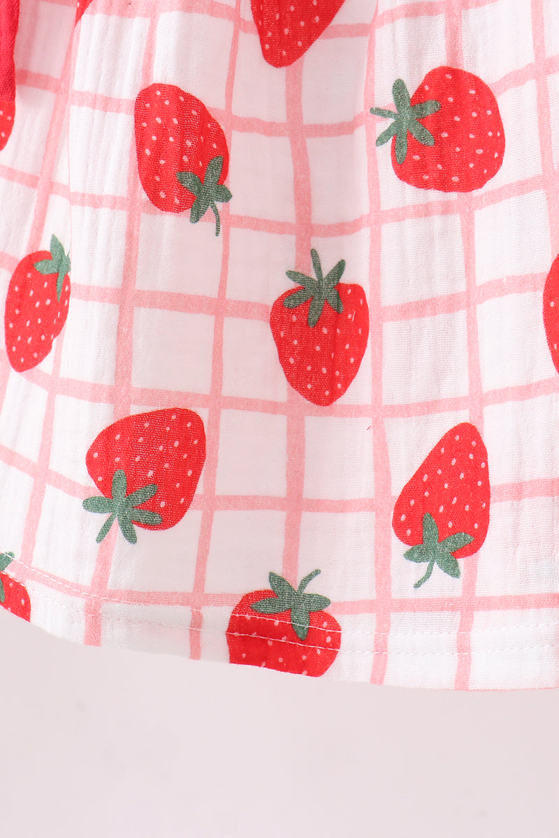 Adorable red strawberry muslin plaid ruffle shorts set perfect for warm weather play. Soft, breathable muslin fabric keeps little ones comfortable all day long. Features charming strawberry and plaid patterns with delicate ruffles on the shorts for an extra touch of sweetness. Ideal for casual outings, playdates, or everyday wear. Machine washable for easy care.